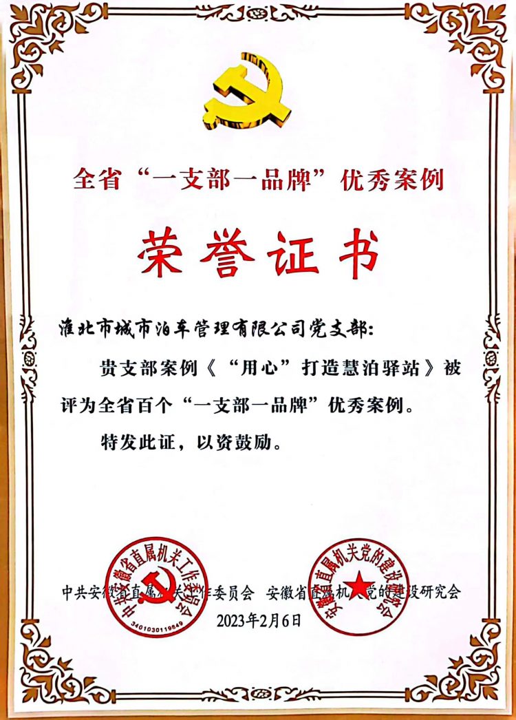日前,中共安徽省直屬機關工作委員會、安徽省直屬機關黨的建設研究會聯合發文表彰了全省百個“一支部一品牌”黨建工作典型案例,此次“一支部一品牌”黨建工作典型案例評選全省共有400家單位586個優秀案例參加初評和復審,最終綜合評定100個“一支部一品牌”優秀案例。淮北城市泊車管理有限公司黨支部獲得通報表彰,支部的黨建品牌《“用心”打造慧泊驛站》獲評全省百個“一支部一品牌”優秀案例。